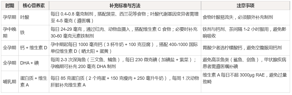 不同时期需聚焦核心营养素,兼顾食物摄入与制剂补充,避免不足或过量。